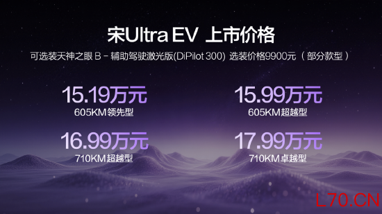 新浪科技讯 3月30日晚间消息,比亚迪宋Ultra EV 正式上市,共4款车型,包括605KM领先型、605KM超越型、710KM超越型和710KM卓越型,官方指导价15.19万-17.99万元。