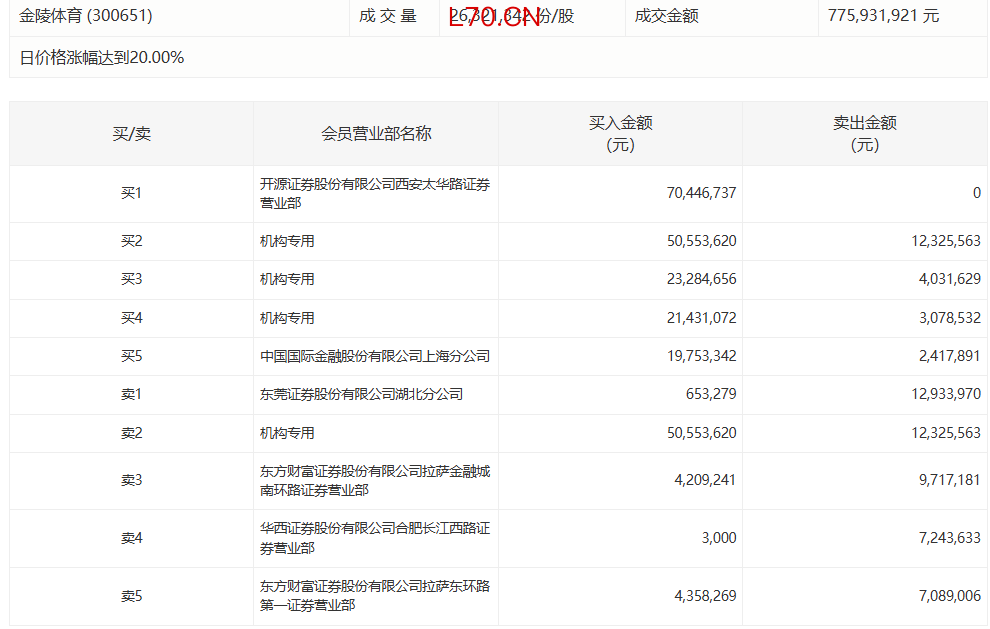 金陵体育今日涨20.00% 3家机构专用席位净买入7583.36万元