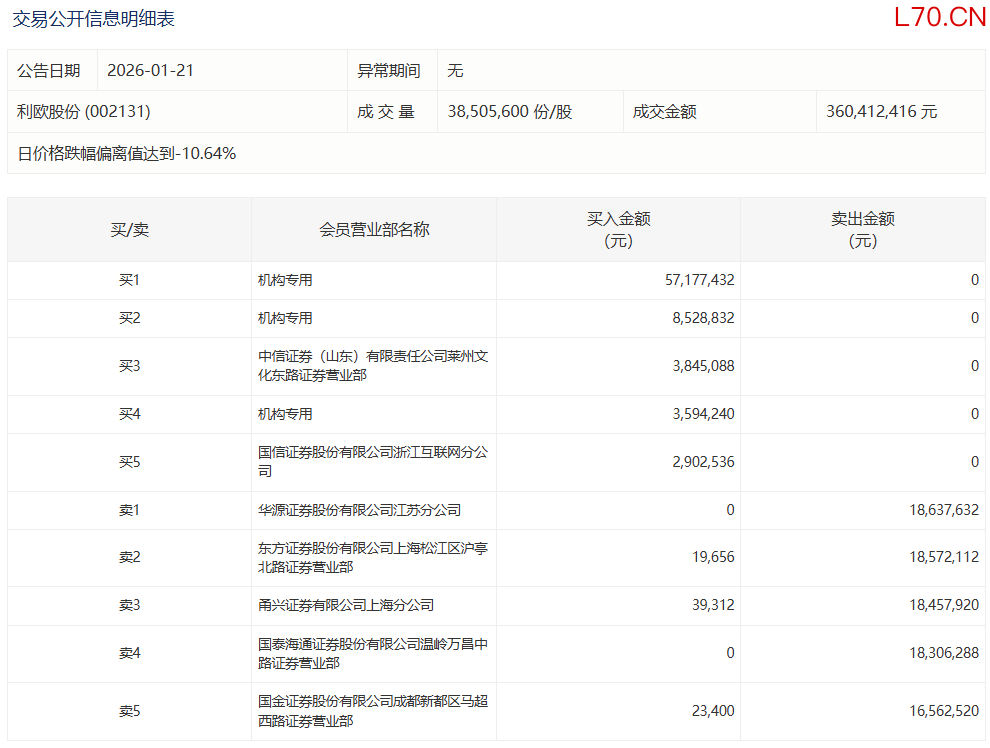 利欧股份今日跌停,3家机构专用席位净买入6930.05万元