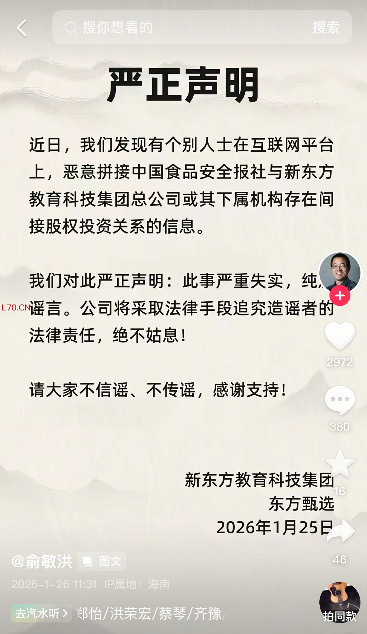 俞敏洪辟谣中国食品安全报社与新东方存在间接股权投资关系:严重失实