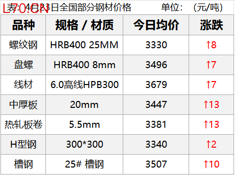 4月23日,钢材现货市场全部上涨,期货市场主要品种主力涨跌不一,其中螺纹涨0.09%,热卷涨0.33%,铁矿跌0.32%,焦炭跌0.22%,焦煤跌0.63%。宏观情绪向好,但成材基本面上行驱动有限,今日钢材盘面呈现冲高回落走势,本周钢材库存继续去化,需求强劲回升,加上美伊局势变化,明日钢价......